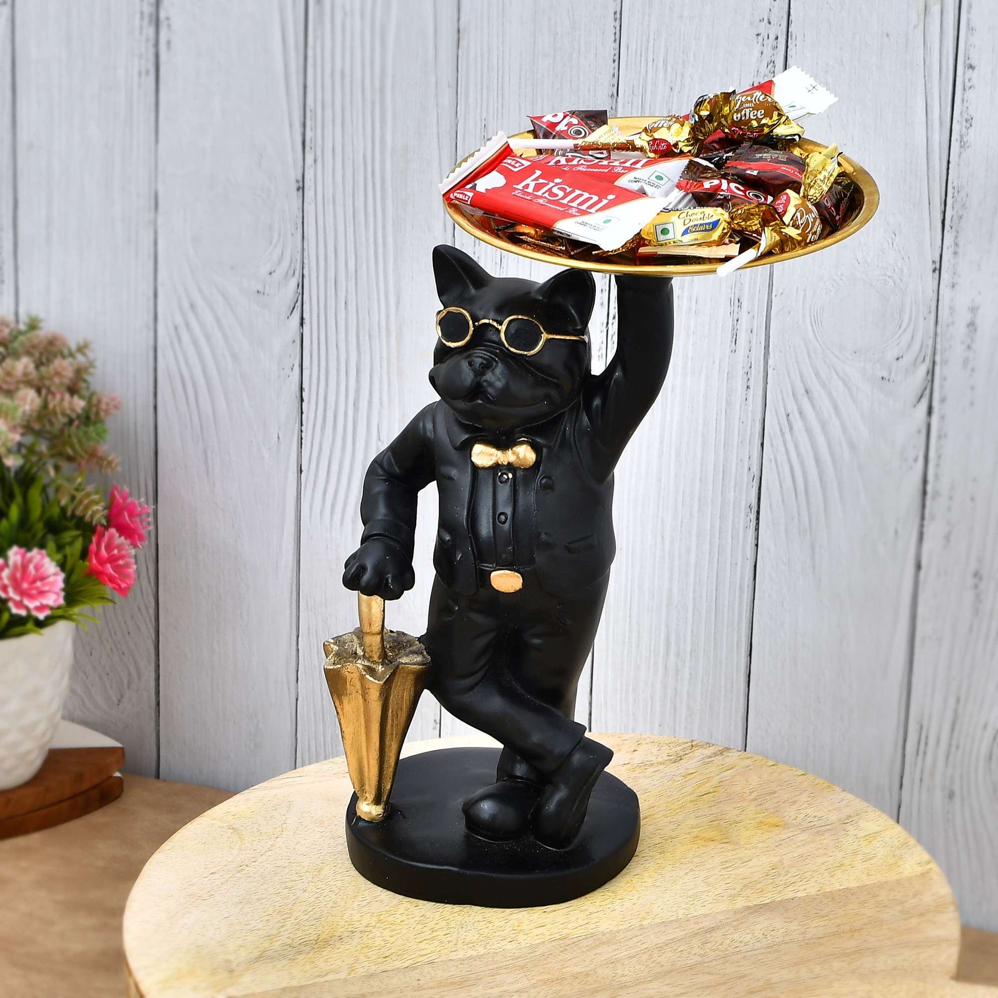The black dog bowl is a classic addition to your living room. It can be used as a cigar bowl or kept at home entrance to keep your car keys. Size: Height:8 Inches, Width: 10 Inches, ; Material: Resin, Color: Black Premium & elegant piece for home decoration & gifting for all purposes. An eye-catching showpiece that serves all occasions such as – Valentine’s Day, Friendship Day, New Year, Diwali, House Warming Ceremony, Home Decoration, Anniversary, Wedding, Birthday Giftings The Statue Idol is a masterpiece exclusive design that adds on the beauty of the table/corner/living room/bedroom/office Use dry or wet cloth to clean the dust.
